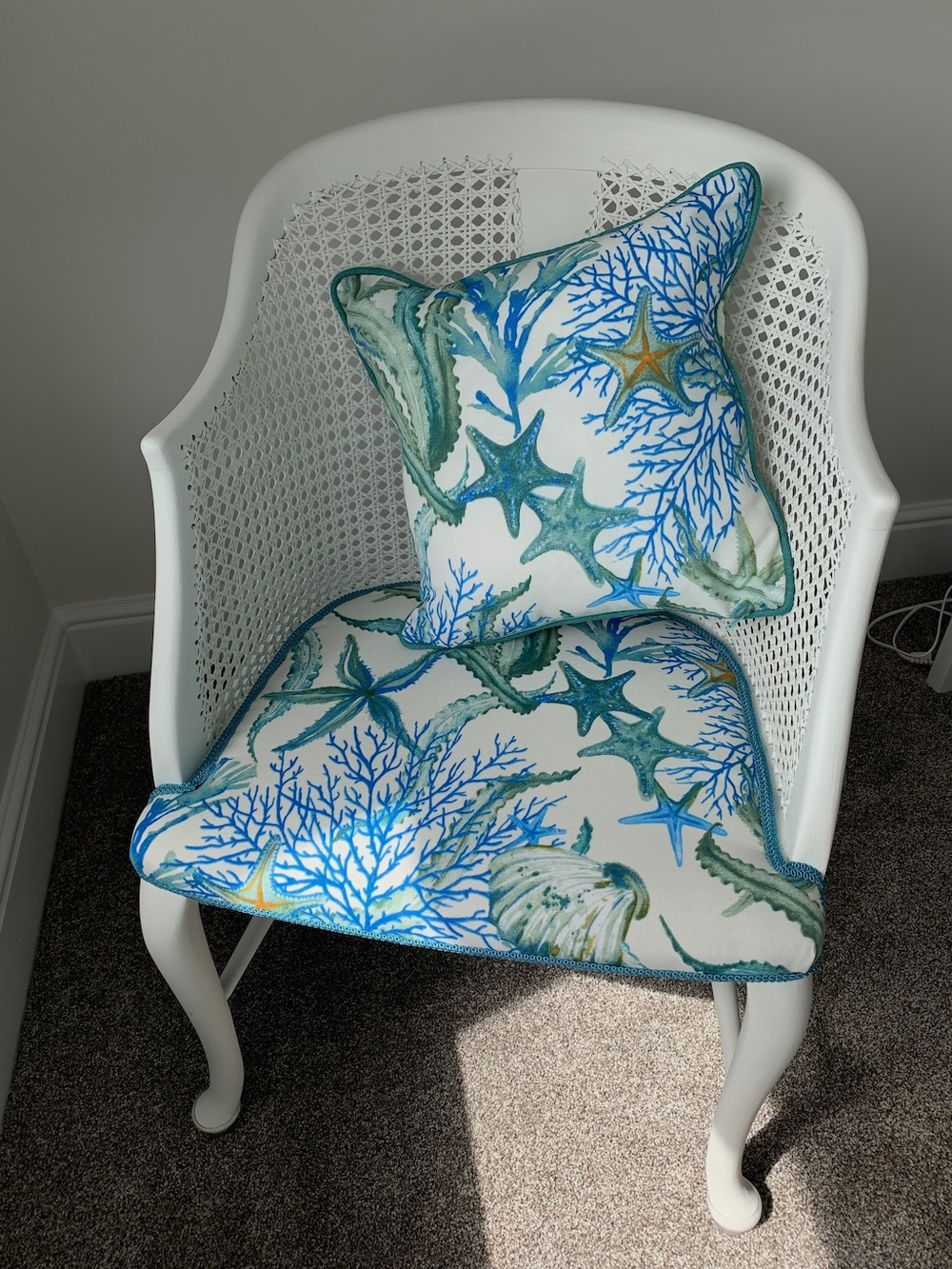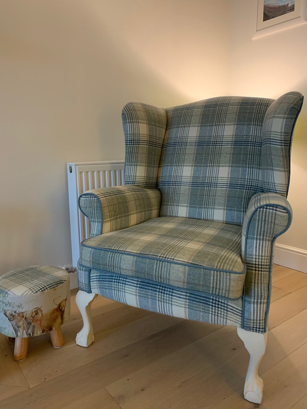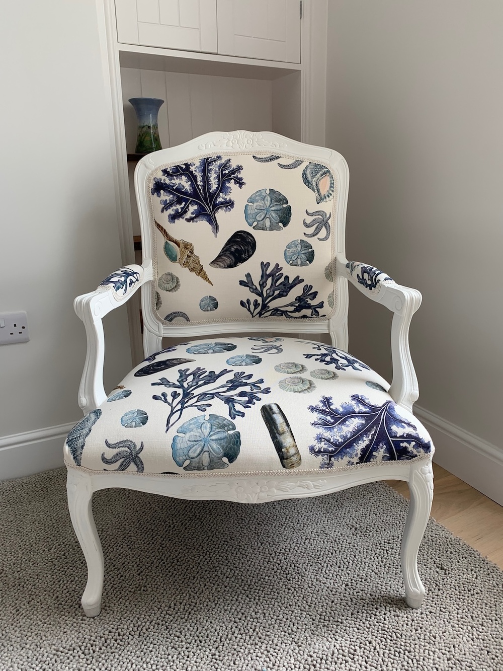 I contacted Susan Myler, Myler Décor, and explained what I was hoping to achieve, and was delighted when she said she could help. Susan already had a few pre-loved chairs in storage which turned out were all going to be perfect for my project. I was short of one though, so turned to Facebook marketplace and eventually found a vintage French armchair that would be ideal. I managed to arrange to have it collected and taken to Bute, where it would begin its new life.