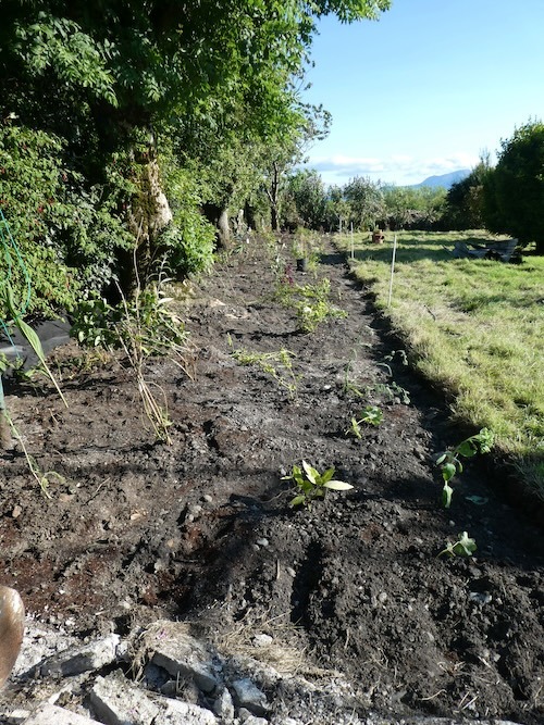 I chose to start by putting in a herbaceous border on the more sheltered side of the garden. This area was 'lawn' backed by a wire fence that had long since been swallowed by weeds. With the help of ‘Old’ Ronnie, from a nearby farm, and his mini digger the ground was cleared and broken up. My mum and I painstakingly worked our way down the bed clearing out weeds, roots and a surprising amount of broken glass?? Adding in some soil improver and fertiliser. I also did my best to tackle the nettles and sticky willies that had taken hold along the fence line, I even put down some weed suppressing matting in the hope of slowing down their inevitable return. Another of my ideas was to plant lots of orange Crocosmia, which grows wild everywhere, as a kind of natural weed barrier - whilst I love their cheery orange flowers, it has now presented me another job to do as they really have to be kept in check....they truly are a plant that wants to grow !! Once all that was done, I could finally turn my attention to plants.