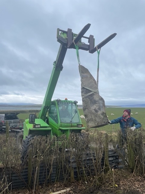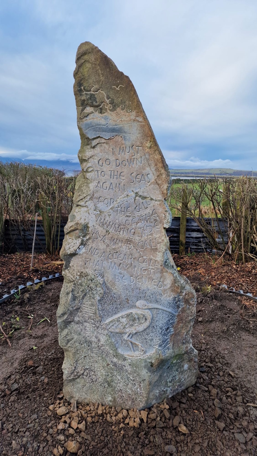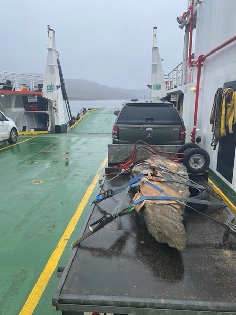 The carving was completed towards the end of 2023, however, it was not until this year that we were able to arrange to have the stone installed. Late February, the stone (a she) was loaded onto a truck up in Speyside and travelled all the way to Bute via Colintraive, finally arriving safely at the Straad. Once there, extra help was needed to get it into the garden and that came in the form of Ronnie Robertson and his trusty lifting gear. The stone was delicately hoisted over the hedge and finally settled into her new home, framed by the beautiful hills of Arran. Seamlessly blending into the landscape as if she had always belonged there.
